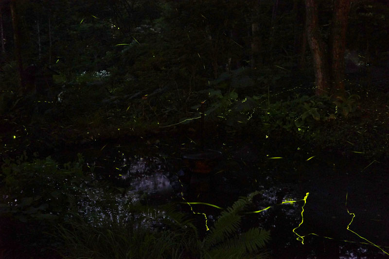 噴水池のホタル、ここは標高1000mの高地だから、平地よりひと月程遅れて7月が蛍の季節。